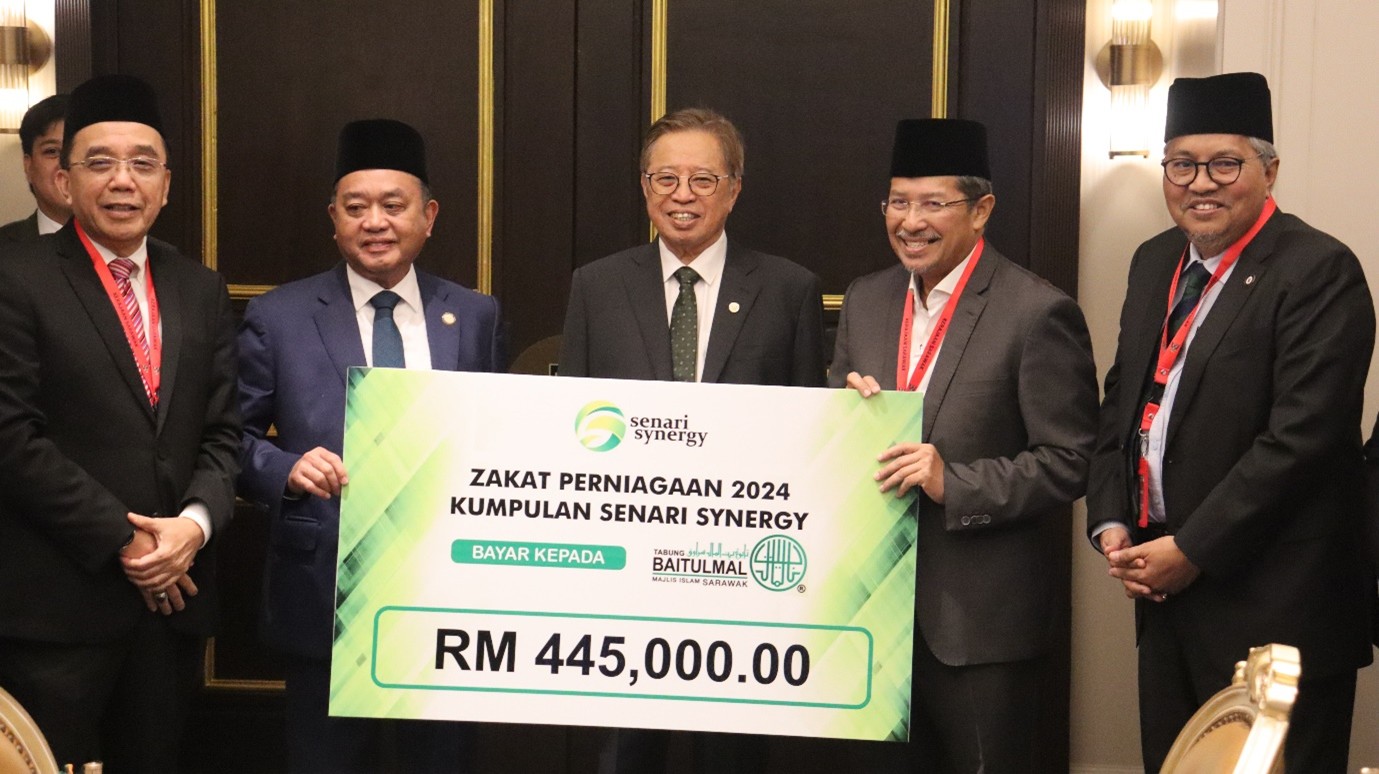 Kuching - Senari Synergy Sdn Bhd today paid a courtesy visit to YAB Datuk Patinggi Tan Sri (Dr.) Abang Haji Abdul Rahman Zohari bin Tun Datuk Abang Haji Openg, the Right Honourable Premier of Sarawak, during which the Group handed over RM445,000 in business zakat to Tabung Baitulmal Sarawak. The handover was witnessed by the Right Honourable Premier and President of Sarawak Islamic Council, YBhg. Datuk Haji Misnu bin Haji Taha.